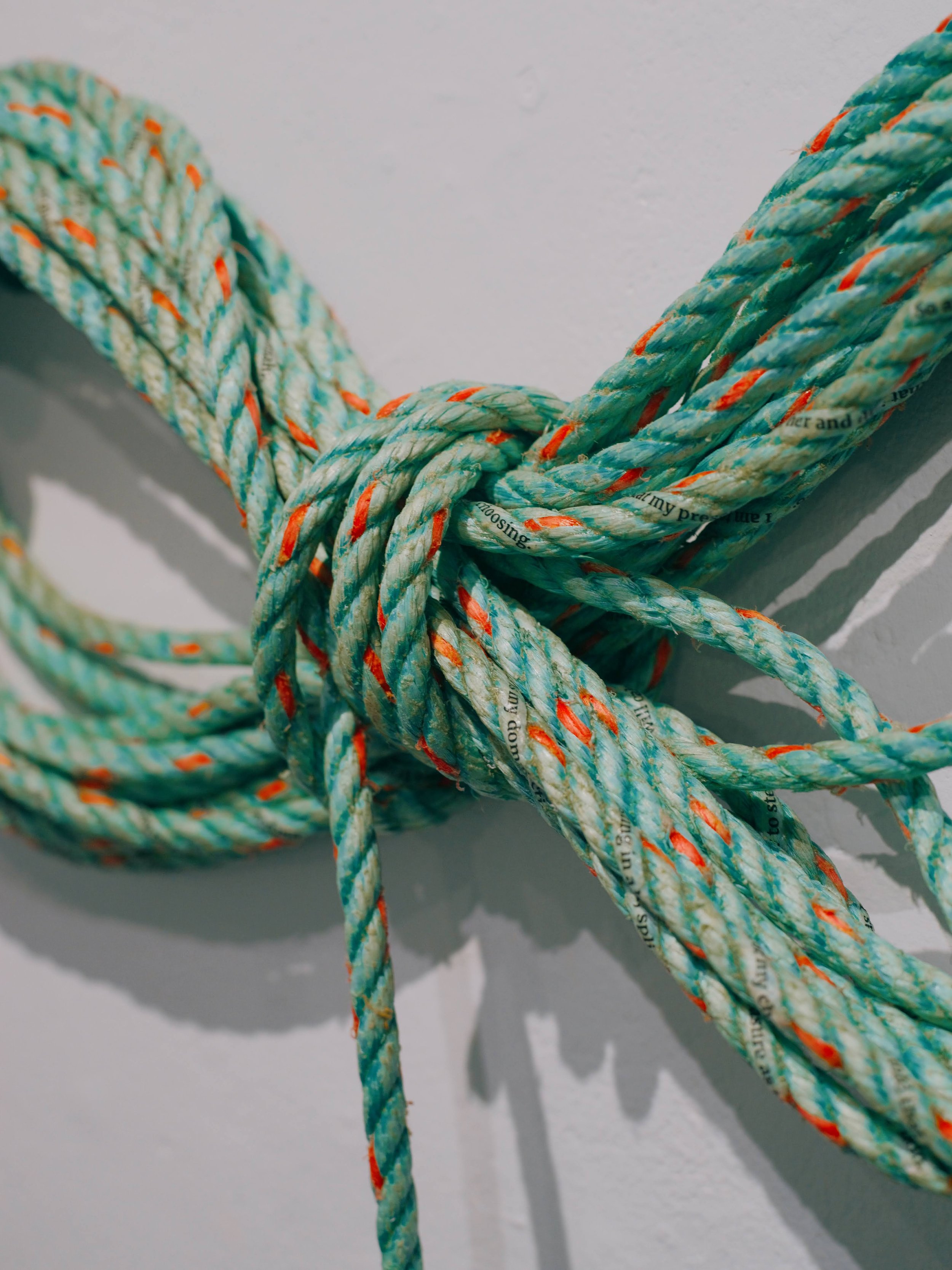 This piece is meant to resemble a coiled-up extension (additional rope that can be added to a buoy line to extend its length). A poem I wrote that shares the title of the piece is repeated along the third strand of the rope. The work belongs to a series that includes Bound, Domain, and The Long Haul. The poem can be found below.