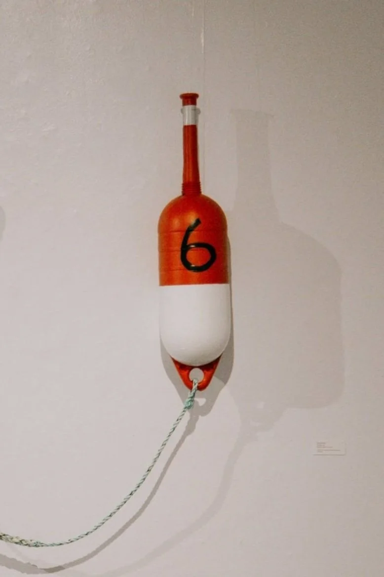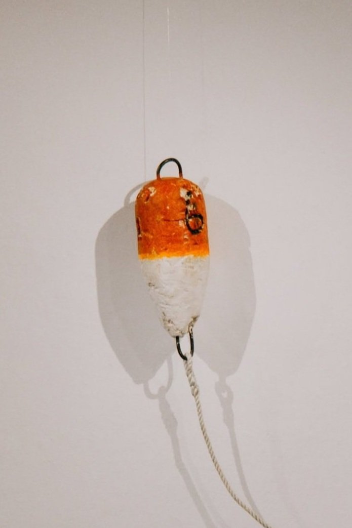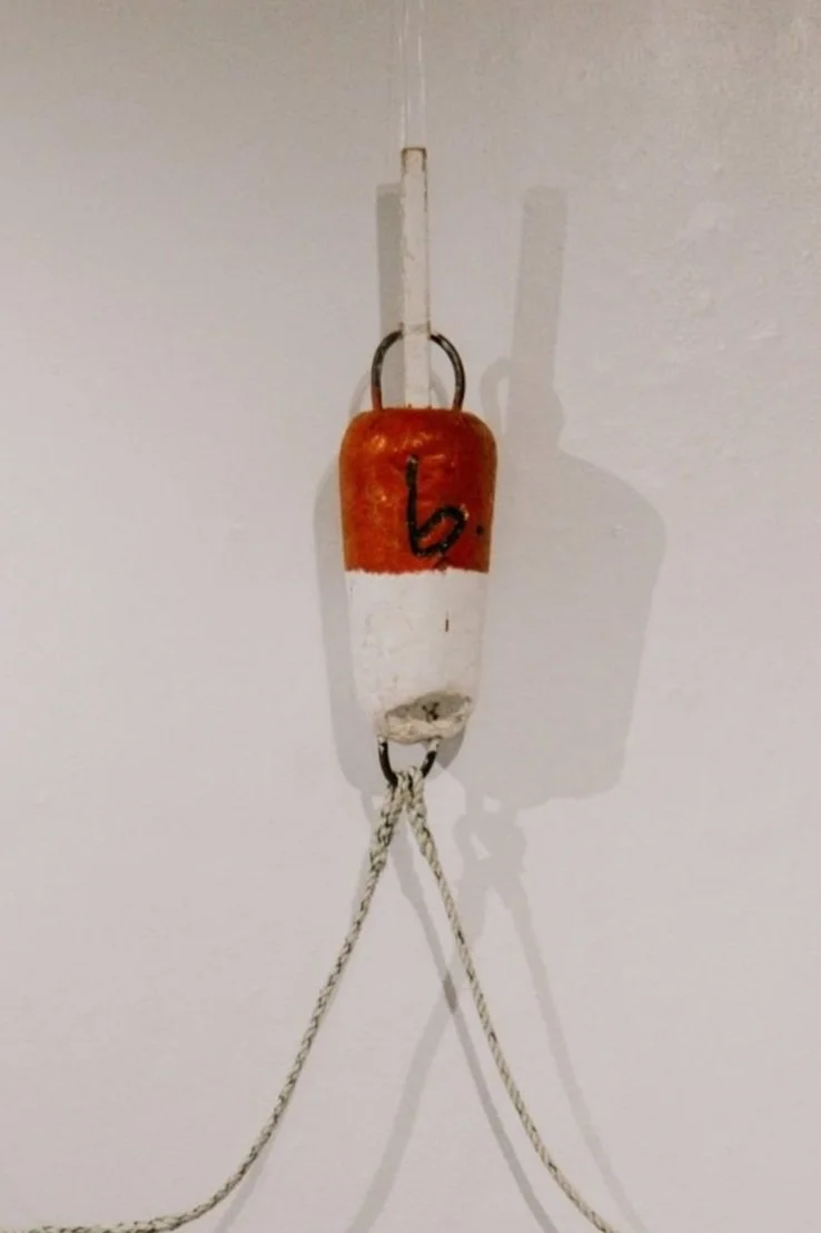 This piece is a collection of buoys made by three generations of fishermen (my grandfather, my uncle, and myself) tethered together by spliced rope.